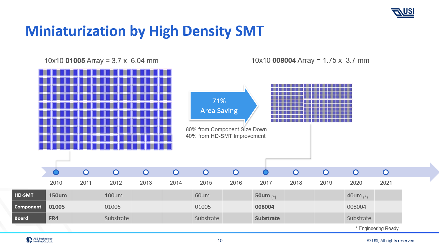 在设计中元器件的数量多寡及排布间距,即是影响模块尺寸的最主要关键。在打件制程方面,业界普遍组件间距为150μm以上,环旭电子已达到小于成人发丝直径的50μm,显现出环旭电子在打件工艺的超高精准度。以10x10数组做比较,大幅缩减超过70%的基板尺寸,其中的40%乃源自于打件技术的突破。