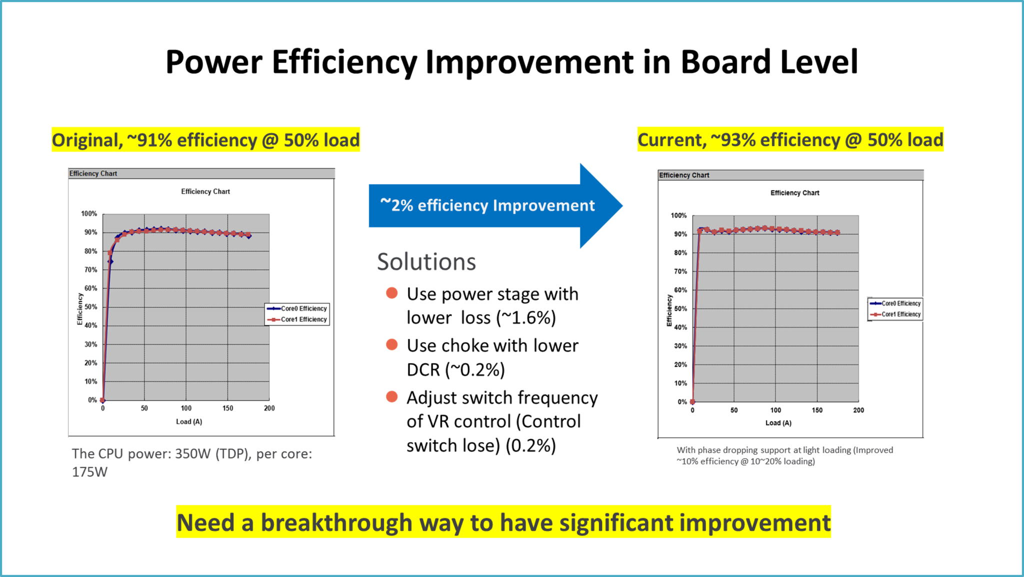 传统透过更换低损耗元件(如 Power Stage 或电感)仅能带来约 2% 的效率提升,面对翻倍的功耗需求,我们必须寻求更激进的架构改变。