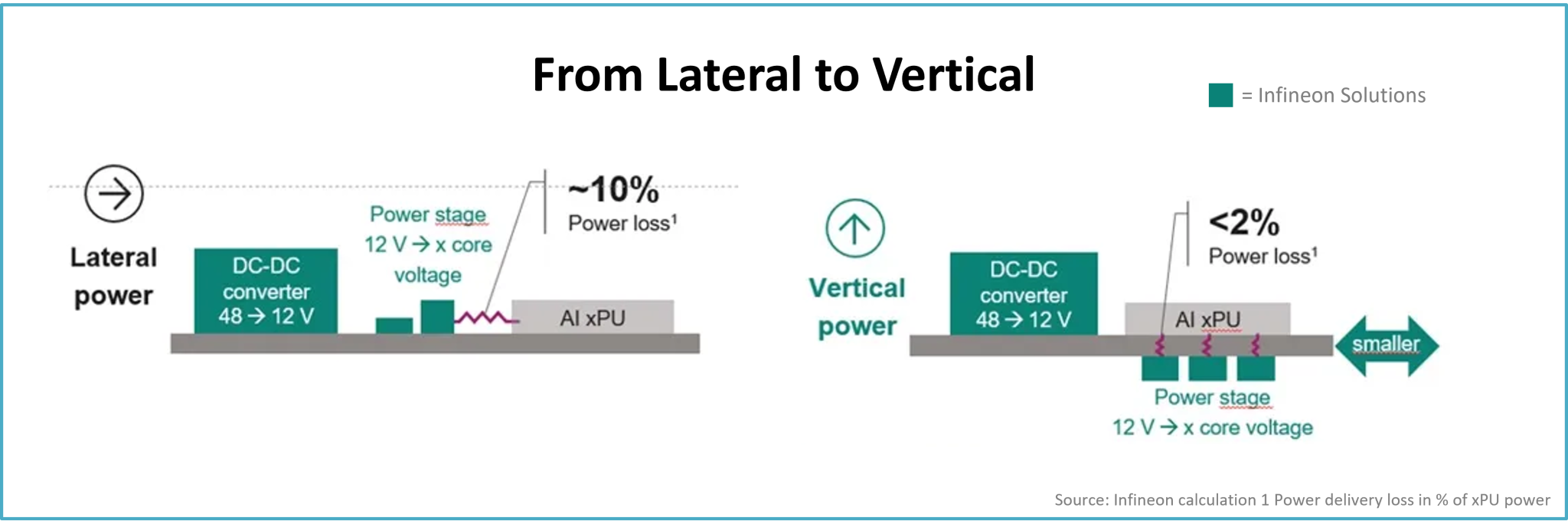 为了满足空间与效率的双重需求,电源架构从横向 (Lateral) 转向 垂直 (Vertical) 已成为业界共识 。USI 的研发重点在于如何透过封装与模组化技术,促使这一架构转型得以落地实践 。