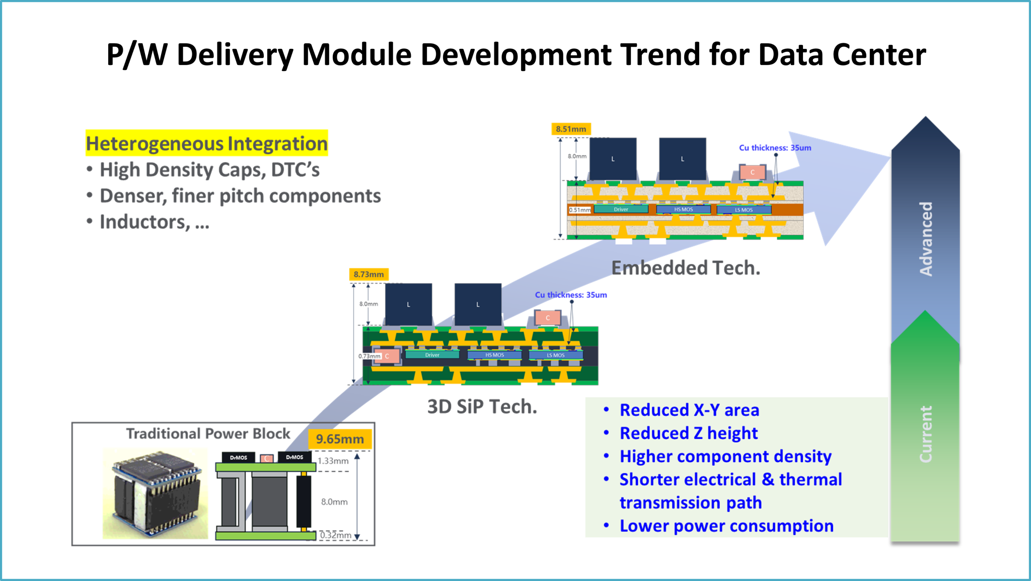 - 显著提升功率密度: 透过 3D 堆迭与埋入式技术,功率密度可从 0.4 A/mm² 提升至 0.6 A/mm²,单位面积的供电能力增加了 50% 。
