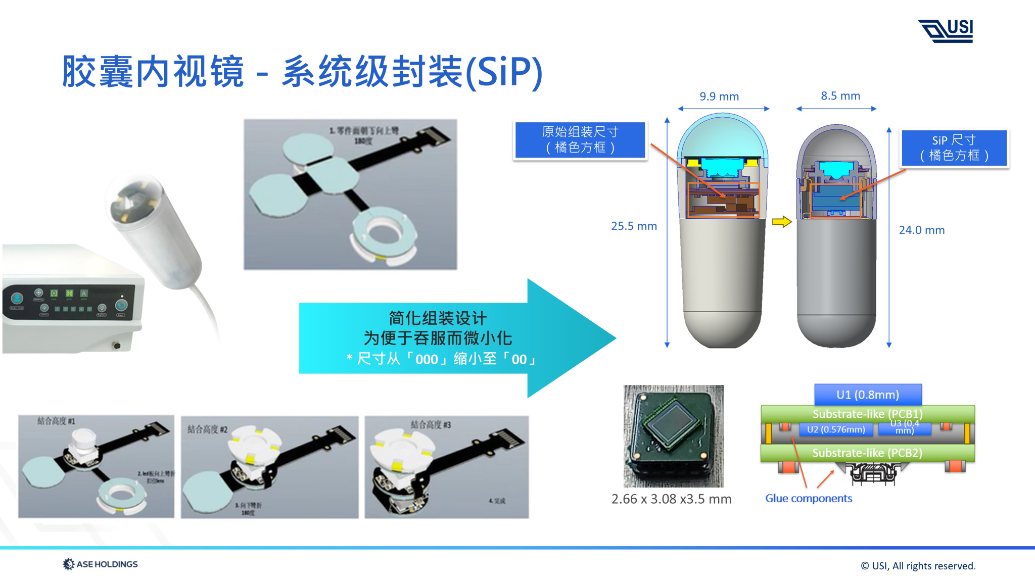• 医疗胶囊内视镜:以 SiP 技术整合影像处理与无线传输功能,达到极致小型化。