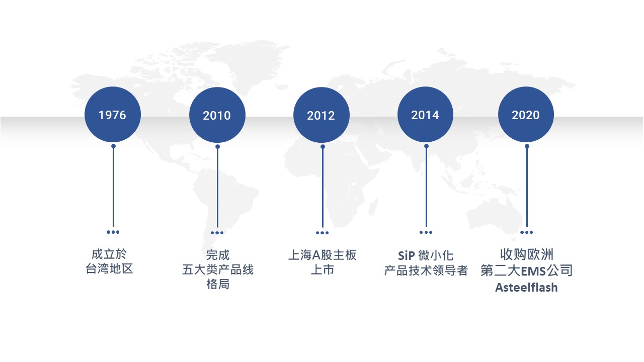 环旭电子成立于1976年,于2012年在上海A股主板上市(上海证券交易所股票代码: 601231),2014年在SiP(System-in-Package)模块领域居行业领先地位,2020年公司完成收购法国第二大EMS公司Asteelflash。有着深厚电子制造技术积累的环旭电子(USI, Universal Scientific Industrial (Shanghai) Co., Ltd.)如今为国内外知名品牌厂商提供D(MS)2产品服务:设计(Design)、生产制造(Manufacturing)、微小化(Miniaturization)、行业软硬件野驴影院在线观看(Solutions)以及物料采购、物流与维修服务(Services)。公司提供的行业服务包括通讯类、计算机及存储类、消费电子类、工业类与医疗及车用电子为主等五大类电子产品。