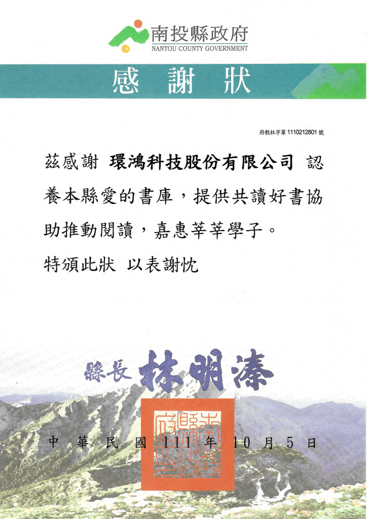 "野驴影视资源" 2022 Nantou County Government Appreciation Certificate–Philanthropic Library (Taiwan Site)