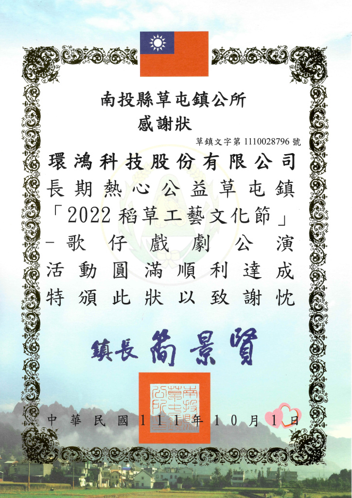 2022 Nantou County Tsaotuen Township Appreciation Certificate–Straw and Craft Cultural Festival (Taiwan Site)