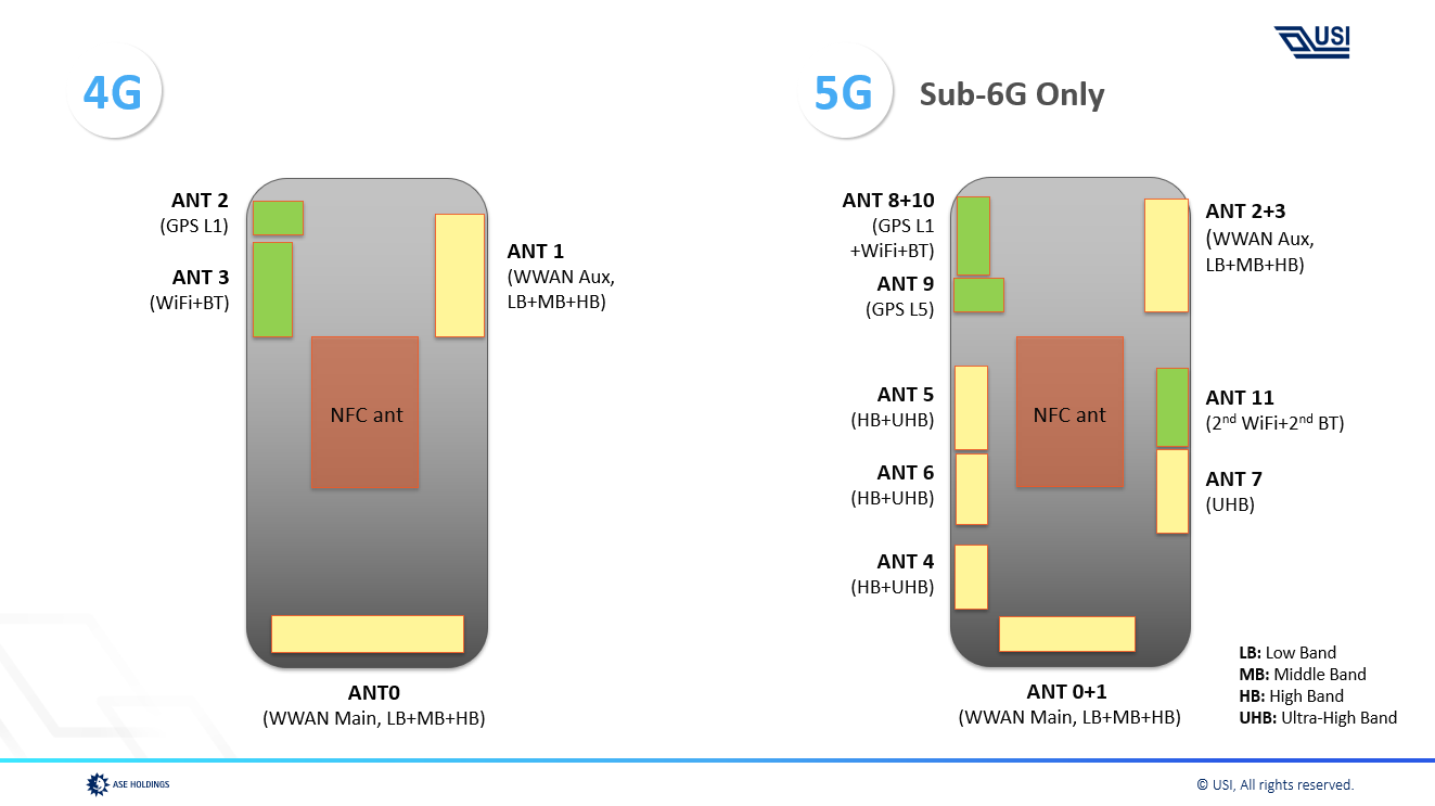 First, as you can see in the comparison below, there is a significant design difference between 4G and 5G antenna placement. The total number of antennae has increased significantly from 5 to 13. 5 new locations occupy battery’s both sides.