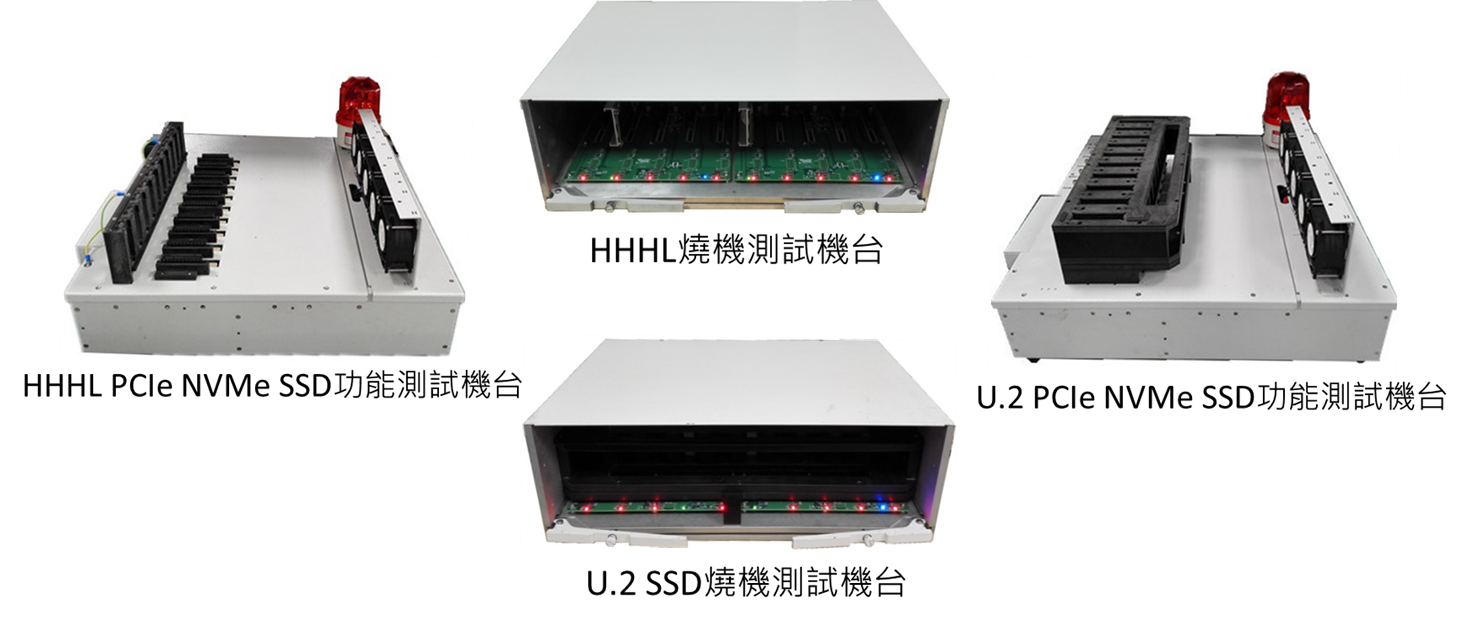 環旭電子所開發的企業級PCIe NVMe Gen3固態存儲(SSD)硬碟測試機台,可以通過不同類型的介面卡和支架,支援固態存儲硬碟(SSD) U.2和HHHL / FHHL不同的外形,可靈活的依據客戶需要,在產線做各種機台的佈署。藉由彈性的平臺布建,加速客戶新產品的上市時程。